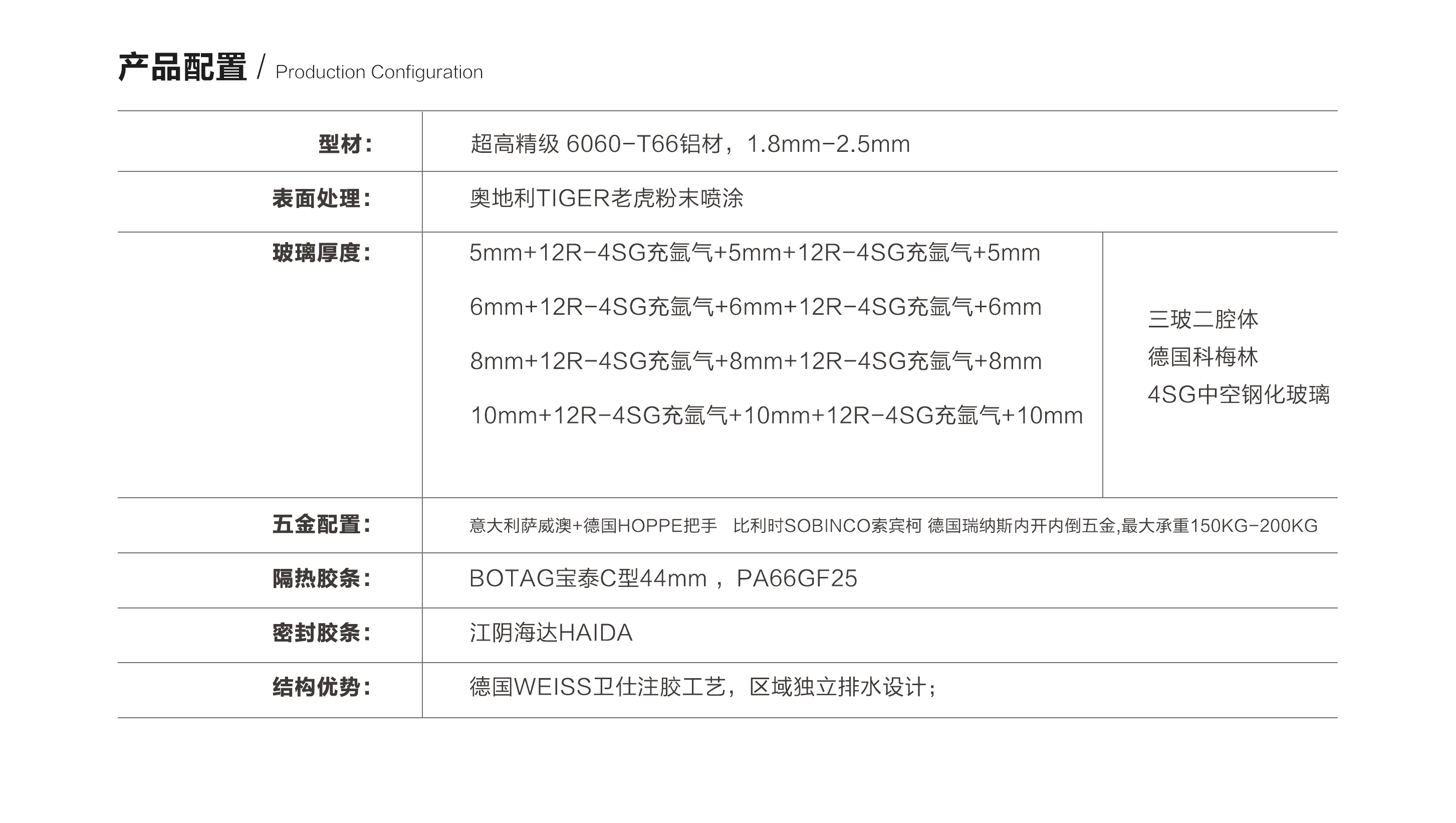 型材:超高精级 6060-T66铝材,1.4mm-2.0mm 玻璃厚度: 5mm+12R-4SG充氬气+5mm+12R-4SG充气+5mm 6mm+12R-4SG充氬气+6mm+12R-4SG充氬气+6mm 8mm+12R-4SG充氬气+8mm+12R-4SG充氬气+8mm 10mm+12R-4SG充氬气+10mm+12R-4SG充氨气+10mm 结构优势: 德国WEISS卫仕注胶工艺,区域独立排水设计