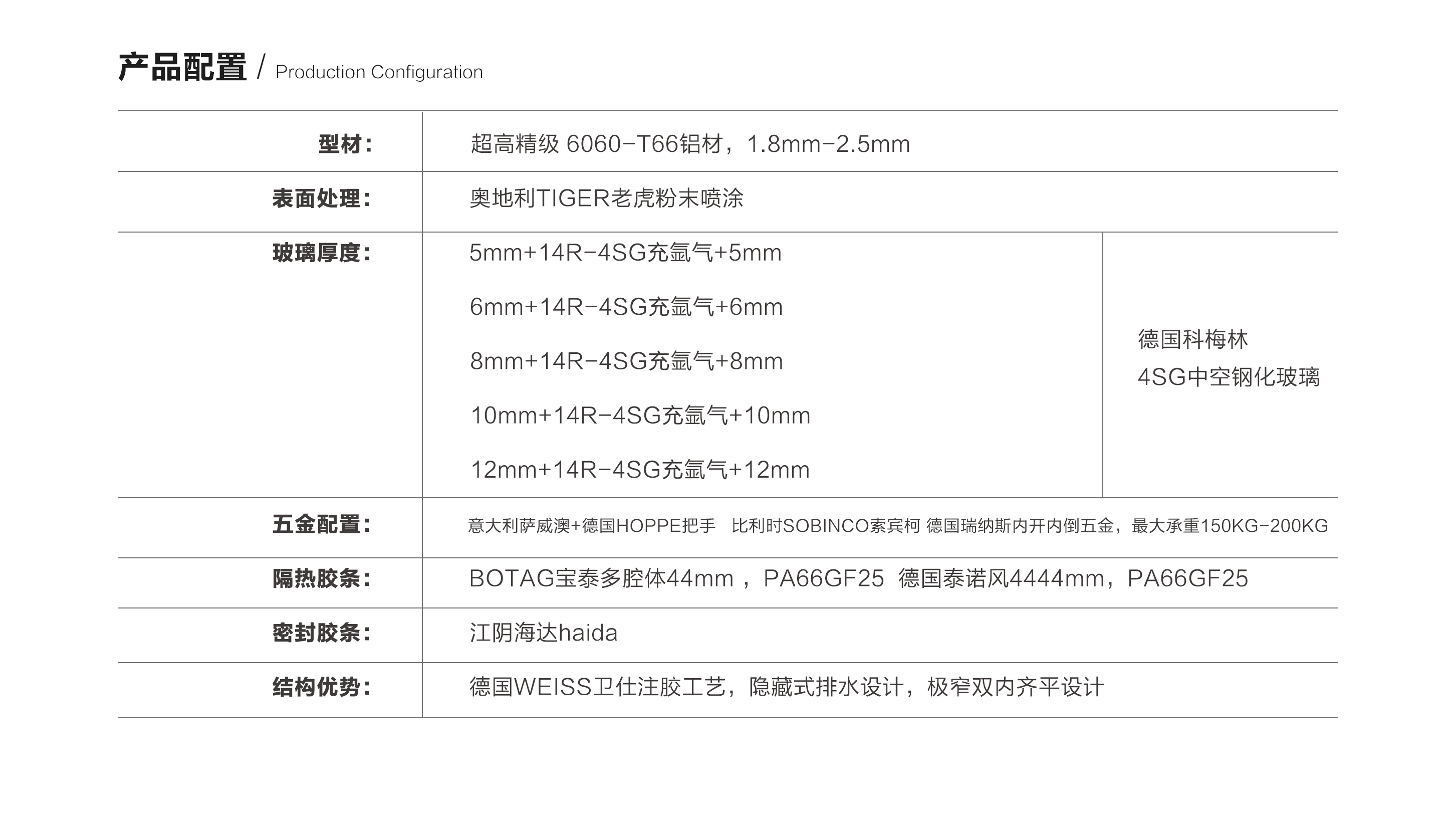 型材:超高精级 6060-T66铝材,1.4mm-2.0mm 玻璃厚度: 5mm+14R-4SG充氨气+5mm 6mm+14R-4SG充氬气+6mm 8mm+14R-4SG充氬气+8mm 10mm+14R-4SG充氨气+10mm 12mm+14R-4SG充氨气+12mm 结构优势: 德国WEISS卫仕注胶工艺,隐藏式排水设计,极窄双内齐平设计