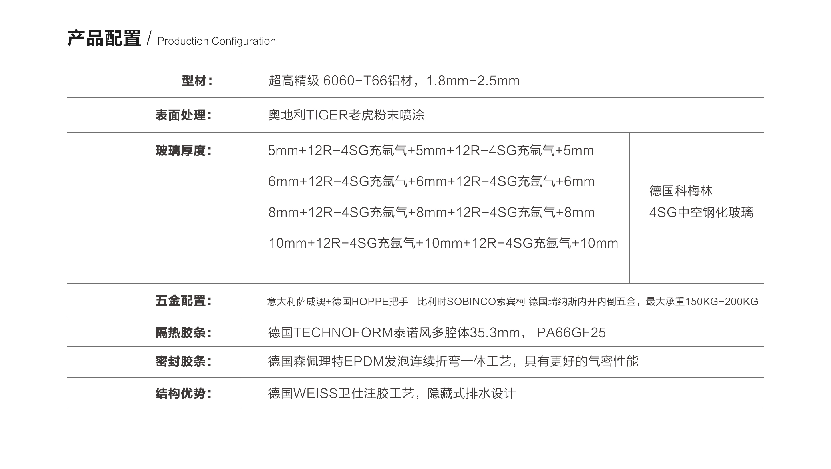 型材:超高精级 6060-T66铝材,1.4mm-2.0mm 玻璃厚度: 5mm+12R-4SG充氨气+5mm+12R-4SG充氬气+5mm 6mm+12R-4SG充氨气+6mm+12R-4SG充氨气+6mm 8mm+12R-4SG充氨气+8mm+12R-4SG充氨气+8mm 10mm+12R-4SG充氨气+10mm+12R-4SG充气+10mm 结构优势: 德国WEISS卫仕注胶工艺,隐藏式排水设计